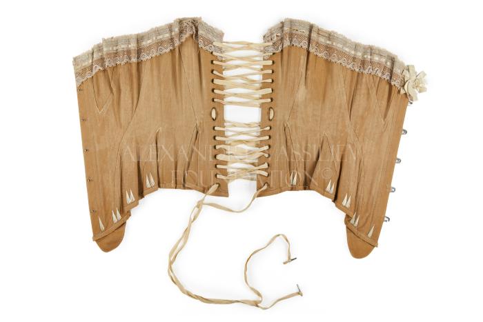 The Royal Worcester Corset Company, was founded as The Worcester Skirt Company by David Hale FANNING in 1861 in Worcester, MA, and first specialized in making hoop skirts. In 1872 the company changed its name to the Worcester Corset Co., to reflect its change of direction from hoop skirts to torso shaping. In 1876, the 'Bon Ton' corset was awarded the bronze medal at the Centennial Exposition in Philadelphia. The company changed its name again in 1901, to the Royal Worcester Corset Company. In 1949 the company dropped the word 'corset' from its name and became known as the Royal Worcester Company, in response to falling interest in corsets. The company had by then switched production away from corsets to girdles.