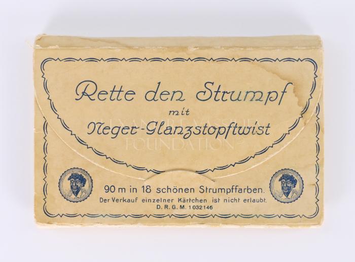 Negergarn Belagarn was a German brand specializing in yarn manufacturing during the 20th century. One of their flagship products was the production of small kits to touch up damaged stockings. Some of their advertisements were racial in nature, at a time when Germany still had colonies in Africa.