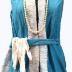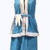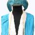 Masquerade gown consisting of a long waistcoat in blue cotton satin, trimmed with white wool, imitating fur, the waistline accentuated with a matching belt, a long skirt also trimmed with wool on the bottom, a Russian kokoshnik style headdress, decorated with blue sequins and round white pearl beads, a matching pearl neckace, and a pair of gloves.