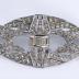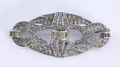 Art Deco design openwork silver metal brooch decorated with tiny rhinestones and small rectangular bohemian crystal gems forming wavy lines motifs with half scallops on the top and bottom.
