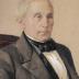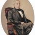 Oval cut photograph portrait, enhanced with gouache, representing a middle aged man sitting in a photographer's studio in a red wooden armchair with fringes, dressed in a black suit consisting of a coat with waistcoat, white shirt with black bow tie, and matching trousers.