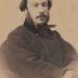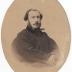 Oval cut photograph portrait, enhanced with graphite, representing a man with whiskers and mustache, sitting in a photographer's studio in an armchair with fringes, dressed in a dark buttoned coat with another material collar, and a bow tie.