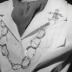 Photograph depicting the Brazilian star model Kouka DENIS, on the presentation of the Autumn-Winter 1960-1961 collection of House of Christian Dior. The woman is wearing a light colour top with pockets on the chest, V-neckline collar with a neckerchief, an imposing chain necklace, and a fashionable scarecrow brooch on the lapel of the collar.