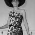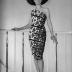 Photograph depicting a woman modeling the summer 1961 collection creation "Tchibanga" of House of Jacques Heim. The model is wearing a casino cocktail dress in white cotton, basket weave with brown and black prints. A large sun doormat style hat adorns her head and matches the print of the gown. On her wrist, there is a large multi strand pearl bead bracelet.