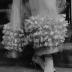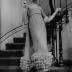 Photograph depicting a woman modeling the Spring-Summer 1961 collection creation of House of Pierre Cardin. The model is wearing an evening dress going down to the ankles, inspired by Empire style, in mauve silk crepe, with a side panel at the back and bubbled with mauve flowers ruffling at the bottom. The gown is completed with a pair of long gloves, and classic high heel pumps.