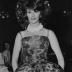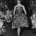 Photograph depicting a model presenting a new autumn collection of the Virginie fashion house. The woman is wearing a cocktail dress in floral printed taffeta with square neckline bodice on two thin straps, and a wide knee-length draped skirt. The look is completed with a large multi strand pearl beaded choker type necklace.