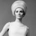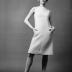 Photograph depicting a woman modelling a Jacques HEIM ensemble of Autumn-Winter 1966-1967 collection. "Gaetan" afternoon dress and coat (not on the photo) in raw wool, the coat is edged with azure mink. High toque hat by in the same mink. The look is completed by a pair of gloves and short heel shoes, and the woman is wearing large pearl bead earrings.