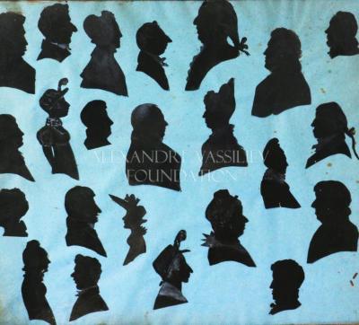 It is a work of silhouettist, probably English, representing men and women. The artist details each distinct facial outline and uses white pastel to add details of clothing when necessary.