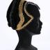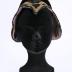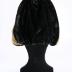 French hood type theatrical hat for a female caracter, made of black velvet pointed on the forehead, trimmed with golden thread braided ornaments, having a rounded cylinder flange on the top, lined inside with purple silk.
