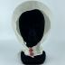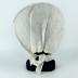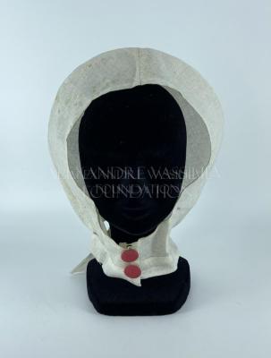 Futuristic hat prototype, made of cotton. Cap fastens with small snap buttons under the chin and tieding up with ribbons at the back. Head gown hand-sewn, fastenings decorated with big, round, red buttons stitched on the top.