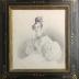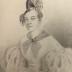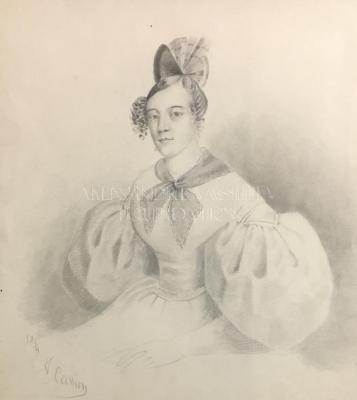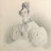 Graphite drawing portrait of a young woman represented in a day dress with long and puffy gigot sleeves with pointy seams on the shoulders, a darker material kerchief tied in a bow through a ring on the neckline. Her hair is in fashionable bow style made with a toupee, and tight ringlets framing the face on the sides.