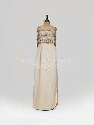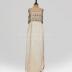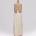 Sleeveless maxi dress made of ivory silk satin with double layer straight cut detail on the chest line embroidered with golden threads, embellished with rhinestones, plastic and wooden beads. Gown closes at the back with a zipper.