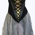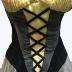 Bustier dress laced in the front with black velvet on yellow fabric, closed by staples on the back, above a grey tulle skirt. Two black knots decorate the bustier at the base of brown elastics.