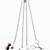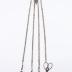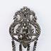 Chatelaine with a top in the shape of an open lyre, mount stamp with beadwork with cut and polished facetted steel studs riveted to a steel frame. Rivetted to the back is a flat steel loop for suspension. The lower edge of the frame is fitted with four closed rings with four chains pending. Each chain terminates in an open hook to which are attached: steel scissors; a steel etui for needles with four needles inside; a drum shaped pin-cushion covered in purple velvet, with steel mounts, containing seven pins; and a steel thimble case in the shape of an acorn lined with purple velvet inside.