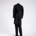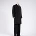 A fine black woolen cloth double breasted men's morning coat, waist-fitted, knee-length, with two rear box-pleats, secured with two buttons on the top, and a vent between them, lined with black silk.
