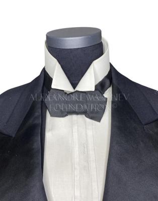 A pre-tied bow tie made of black silk satin. It is already folded into a bow with two double ends on a white ribbon ending with a stratching part on which a hook is attached from one side and a ring from another.