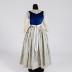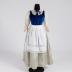 Stage peasant dress of Solange SCHWARZ, star of the Paris Opera, possibly for the ballet "Giselle". The bodice is made of blue velvet with white cotton collar and three-quarter length sleeves in the same flower embroidered cotton. A blue ribbon goes through the edge of the collar neckline and ties on the back. Long skirt of the gown is in pale blue taffeta.