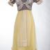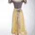 Stage peasant dress of Solange SCHWARZ, star of the Paris Opera, possibly for the ballet "Giselle". The bodice is made of pale, dusty purple velvet with a white pleated chiffon trim on the collar, short velvet sleeves with vertical chiffon inserts and cuffs. A pastel green large ribbon crosses on the bodice and goes to the back creating a long belt. Medium long skirt of the gown is made of yellow taffeta, covered with white dotted embroidered tulle.