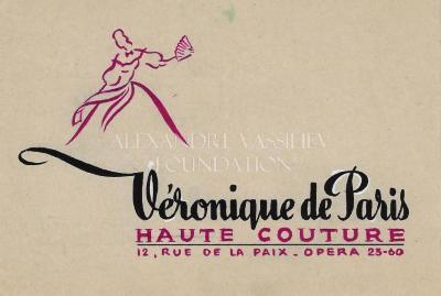Prepress proofing design project for a business card for the fashion brand Véronique de Paris. Véronique de Paris is written in black in the middle of an illustration representing in pink the silhouette of a woman wearing gown on "Camille" (1936) film inspiration and holding a fan at the top left and in the bottom right corner is the text "Haute Couture, 12, rue de la Paix" with an phone number "Opera 23-60."*