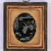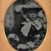 Small ambrotype contained in a leather case and representing a portrait of a child dressed in a cloak and wearing a hat on his head trimmed with a large ribbon ending in a large bow.