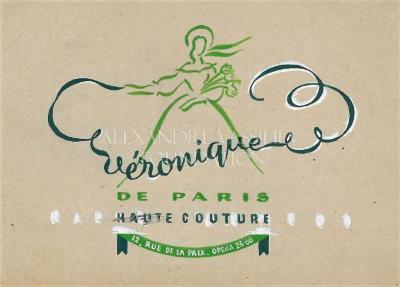 Prepress proofing design project for a business card for the fashion brand Véronique de Paris. The illustration shows a woman wearing a dress in the style of the film "Camille" based on the novel by Alexandre Dumas fils, and holding a bouquet of flowers in her right arm and in her left hand a kind of ruban drawing the name "Veronique", all above it a text "de Paris Haute Couture, 12, rue de la Paix" with a telephone number "Opéra 23-60". "Véronique de Paris Haute Couture" is written in two shades of green, and an old way, more longer, to writte "Haute Couture" is erases by a white correction.