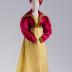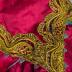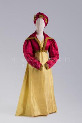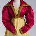 Red silk satin spencer with wide long sleeves gathered on the top and wide point collar. Garment edges and bodice back embellished with gold embroideries. Jacket with linen lining.