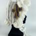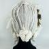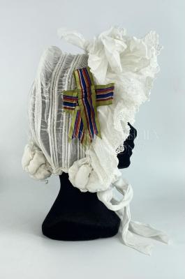 Women's white cotton regency hat embellished on the right hand side with a green, red, navy blue and wide striped satin ribbon. Front border are made of layered wide cotton ribbons, and the cap fastens with two wide ribbons made of the same fabric as the main headwear.