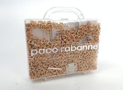 Do-It-Yourself disc dress kit by Paco RABANNE, presented in a plexiglas case containing a batch of metallised rhodoid pellets and metal rings to be assembled together with its instructions for use.