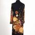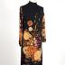Long-sleeved dress in silk jersey with printed bouquet of flowers on a black background.