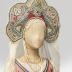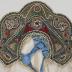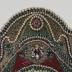 Traditional Russian headdress, decorated with beads, rhinestones, sequins and glass paste stones on a red and green background. Closure with a blue silk ribbon.