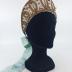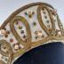 Kokoshnik headdress circular shape braided with golden threads and pearls. Grey pearl background with pale blue ribbon.