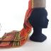 Volga Headdress in red cotton with gold thread embroidery at the front and with a tail at the back, embellished with multicolour embroidery applications and silk ribbons.