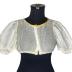 Russian style theatre blouse in ivory cotton muslin with round neckline trimmed with yellow silk ribbon.