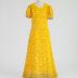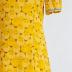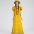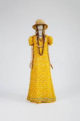 Long dress in cotton blend with yellow Afro faces printed on a brown background, long sleeves, hems lined with velvet braid.