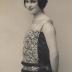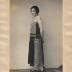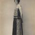 Photograph portrait of a woman standing in a photographer's studio with her arms crossed behind her back, and stands in profile on a Gabbeh. She is wearing a long black dress, trimmed with machine weaving guipure lace, covering the bodice and the side of the skirt, accentuated on a low waistline with two padded lines and a stylized rose on the side made of silk, in the style of Paul POIRET.