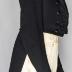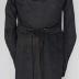 Black wool tailcoat with revere collar and lapels finely hand quilted. Garment double breasted and may be worn left over right or visa-versa with black silk buttons embroidered with single black thistle, outer tail pockets, 1 hidden inner pocket.