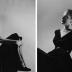 Lot of two photographs showing Dina VARENOVA looking out of focus. The young woman is wearing a black dress with a plunging pleated neckline, belted at the waist with a leather belt. A necklace and leaf-shaped earrings complete her figure. Her hair is in a bun and she is wearing a pair of black pumps.