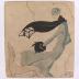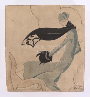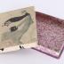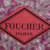 Commercial cardboard box from the chocolate house Foucher Paris. A wallpaper print drawing by Pierre PLANCHENU is placed on the lid. It depicts a woman struggling against the wind in the middle of a cloudy landscape. She is dressed in a hat and a green suit with a black sleeve. A long scarf with floral embroidery around her neck flutters in the wind. Next to her, a fine Labrador retriever raises his head in the wind. A line of horizons, hills planted with cypress trees, and the silhouette of a bird can be seen on the sides. The inside of the box is covered with a shimmering paper with purple and pearly iridescences. A pink diamond-shaped insert inscribes the name of the house in the middle.