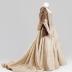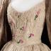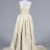 A couture ball/bridal gown with the boned bodice overlaid with ivory guipure embroidered with pink, green, and pearl beaded flower springs. Dress with satin-covered buttons to the low back, bands of lace with beads on the skirt with a train. The dress is embellished with machine-made lace with hand-embroidered glass beads and imitation pearls.