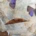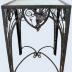 Square pedestal table in wrought iron and glass top inlaid with butterfly wings, forming a floral composition in one corner, and multicolour butterflies of different sizes flying around. The iron base has horizontal and vertical hammered lines, and decorated in the center of each side with a high relief ornamentation of a bunch of grapes with vine leaves, and four bent lines going from the top to each leg creating an Art Deco style ark. The legs are connected with each other inside in the center with four simple iron vaults.