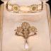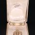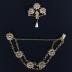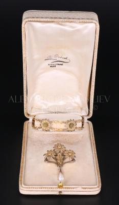 Filigree gilt silver parure consisting of a bracelet and a brooch with the same motif of daisies in original case. The bracelet is made of five flowers linked between each other with two rows of two ring chains, closing with a push in clasp with a security chain. The brooch has an Art Nouveau triangle shape made of three flowers and a leaf on the bottom center, ending with a pear shaped pearl pending on the bottom. The parure comes in its rectangular wooden case covered in white leather with finely embossed golden frame, forming stylized hearts made of scrolls. The box is lined under the lid with white silk, and ivory velvet on the bottom, and has an oval bracelet holder and a cut insert for the brooch.