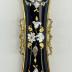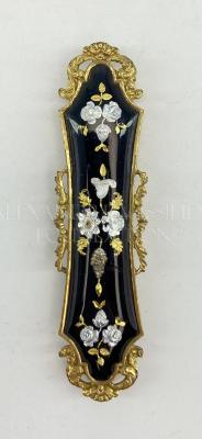 Belt buckle in brass embellished with ornamentation representing vegetal motifs on the edges and with black enamel decorated with floral pattern in the middle.