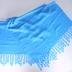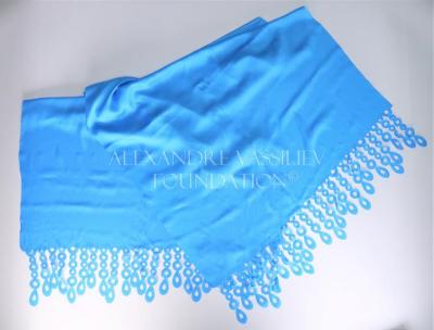 Large electric blue silk scarf festooned with circular ribbons at its ends, laser cut. These scarves can be used as an Islamic veil.