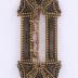 Large women's belt buckle in brass decorated with nailed down cut steel elements, occupying the whole frame, with two flat long rectangles on the sides, and three triangles on the top and the bottom. The decoration is underlined with small dotted brass patterns.