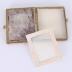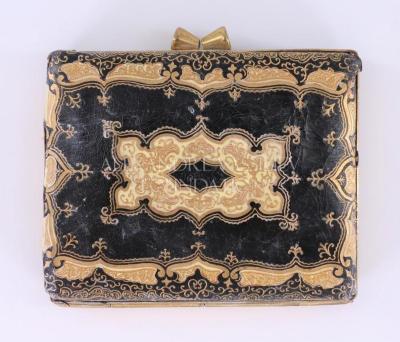 Rectangular shaped compact powder case with mirror on a hinged brass metal base with embossed Florentine leather decoration on the front in black color with gold and white stamped print, and embossed stylized floral motifs on the back. The compact has its used sifter for use with loose powder, but can also hold pressed powder trays.