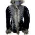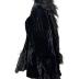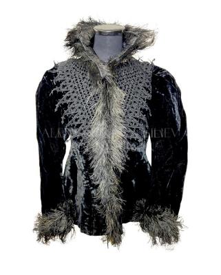 Black velvet jacket embellished with black lace application at the front and on the top at the back. Garment edges trimmed with grey ostrich feathers.
