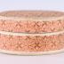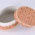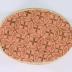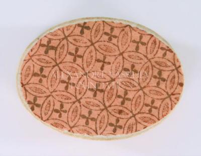 Small oval cardboard cosmetic box, destined to contain loose make-up powder pigments. The box is covered in a pale peach colour paper on the lid and the sides, with printed repetitive pattern of golden crosses inside circles interlacing between each other.