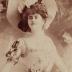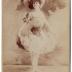 Cabinet format photograph depicting a young woman in a carnival costume, consisting of a knee-length dress, with multiple layers of ruffles on the skirt, covered with lace, and sequin embroideries, tight waistline with a dark colour scallop shaped applique, heart shaped bodice on pleated straps with short sleeves. The lady is wearing a large hat, embellished with feathers, and a pair of shoes on small heels with ballet ribbons.