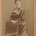 Cabinet format photograph depicting a woman standing in a photographer's studio behind a carved wooden chair with tapestry back. She is wearing a silk dress with a bustle skirt, three-quarter length sleeves embellished with glass bead embroideries and lace, feathers on the back of the waistline and on the square neckline, and a floral brooch on one side. The lady's hair is attached in an updo style with pinned waves, and she is wearing a cuff bracelet on her wrist.