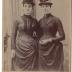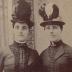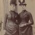 Cabinet format photograph depicting two young women, probably sisters, represented in a photographer's studio. The lady on the left is wearing a bustle skirt dress with buttoned bodice, embellished with frog fastener imitating appliques on the front and the cuffs. Her collar is pinned with a long brooch, and she is wearing a hat embellished with feathers. The lady on the right is wearing a similar, more simple type dress, also buttoned on the front, with a shiny brooch on the collar, and a small hat with some decorations on it.